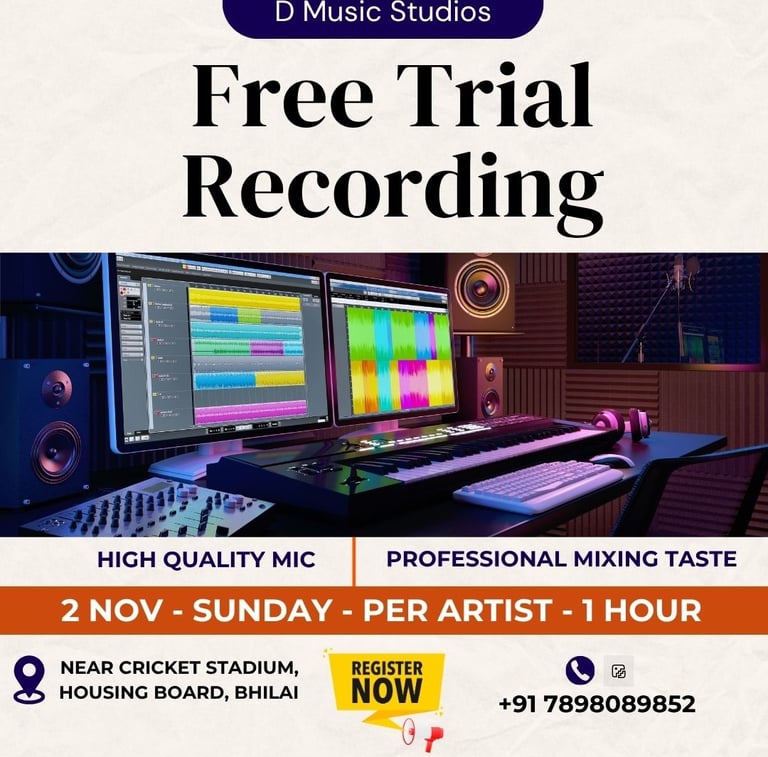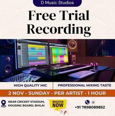 We D music studios , situated at Housing Board, Bhilai . With our superior technical facilities, we make sure to be more flexible and adaptable to the needs of our clients. Our experienced engineers are seasoned to provide you with flawless and high quality audio output. Our engineers are best in mixing and editing all types of Audio. We provide end to end services to our clients from plan to completion.